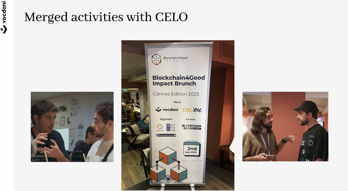 In the past season, some Celo stakeholders supported Vocdoni’s first steps into the ecosystem through projects such as Prezenti grant ($10k), Blockchain for Good Alliance(BGA) grant ($10k), Celo EU with cofunded activities, and joint activations at ETHCC (UNDP <> Celo event) and the Impact Brunch (Vocdoni<>BGA<>UNDP<>Celo). These collaborations confirmed a natural fit between Vocdoni’s governance technology and Celo’s mission.