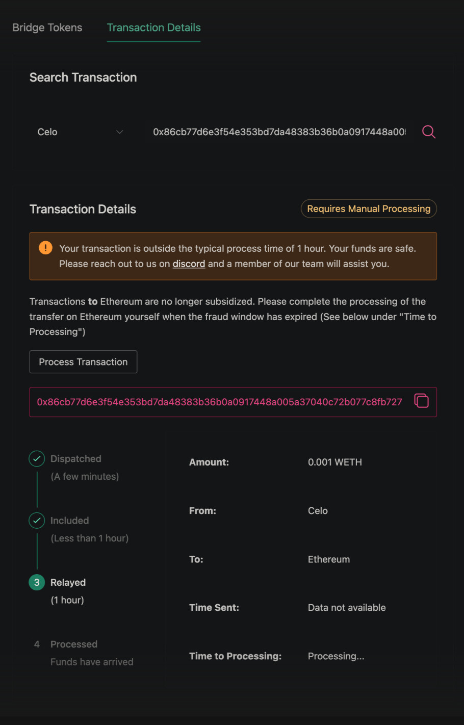 I am trying to bridge from Celo to Ethereum network but my transaction is stuck for more than 24 hours. I get the message “Your transaction is outside the typical process time of 1 hour. Your funds are safe. Please reach out to us on discord and a member of our team will assist you.“.